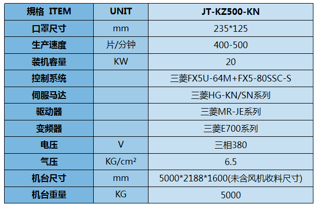 高速智能KN95口罩制片機JT-KZ500-KN是一臺全自動化智能化的KN95口罩制片機,設備通過送料系統(tǒng)、布料成型系統(tǒng)、鼻梁條成型切割系統(tǒng)等工序的配合,生產出蝶形口罩的主體。整機從入料、鼻線插入、成型、裁切成品均為自動化作業(yè),每分鐘可生產500片以上。該生產設備性能穩(wěn)定,產量高,良率高,易于操作。生產的KN95口罩佩帶舒適,口罩過濾效果好,契合人的臉型。